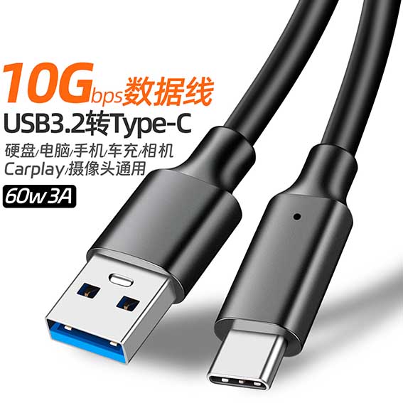 Type-C data cable, USB 3.2 to Type-C transfer cable, 10Gbps hard drive cable, car-mounted 3A 60W PD fast charging cable